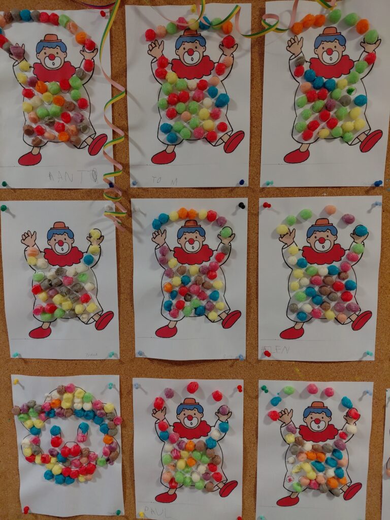 Vor allem Clowns waren ein großes Thema und sehr beliebt. So wurden Clowns ganz bunt mit Playmais verziert, Clowns aus Pappbechern mit lustigen Luftballonnasen, Clowns mit bunten Haaren aus Klopapierkreisen und aus Klopapierrollen mit Luftschlangenhaaren gestaltet.