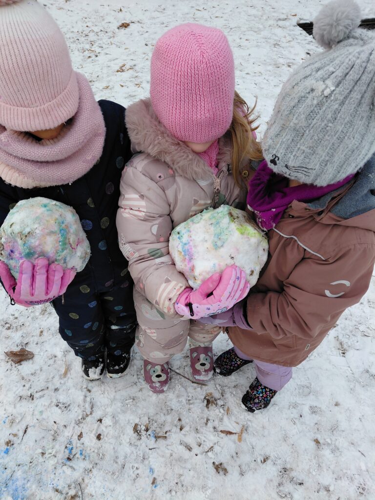 Der verschneite Garten bot zahlreiche Möglichkeiten zur Bewegung und zum freien Spiel. Mit großer Begeisterung bauten die Kinder Schneemänner und gestalteten den Schnee mit bunten Sprühfarben. Passend zu unserem Jahresthema „Farben“ entstand so eine lebendige, farbenfrohe Winterlandschaft.